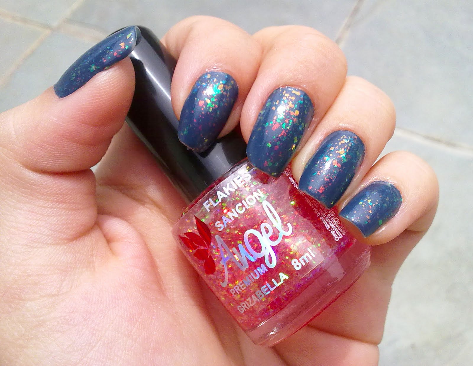 Como mostra na foto, o esmalte base que escolhi foi o Jeans, demorei tanto para passa-lo e achei justo que ele fosse o primeiro a ser usado junto de um flocado. Como Top Coat, o Grizabella, que acima do jeans, os flocos ganharam cores como verde e vermelho. A quantidade de flocos vai depender de quantas camadas de mão você vai dar. E sem esquecer do Extra brilho pra finalizar!
