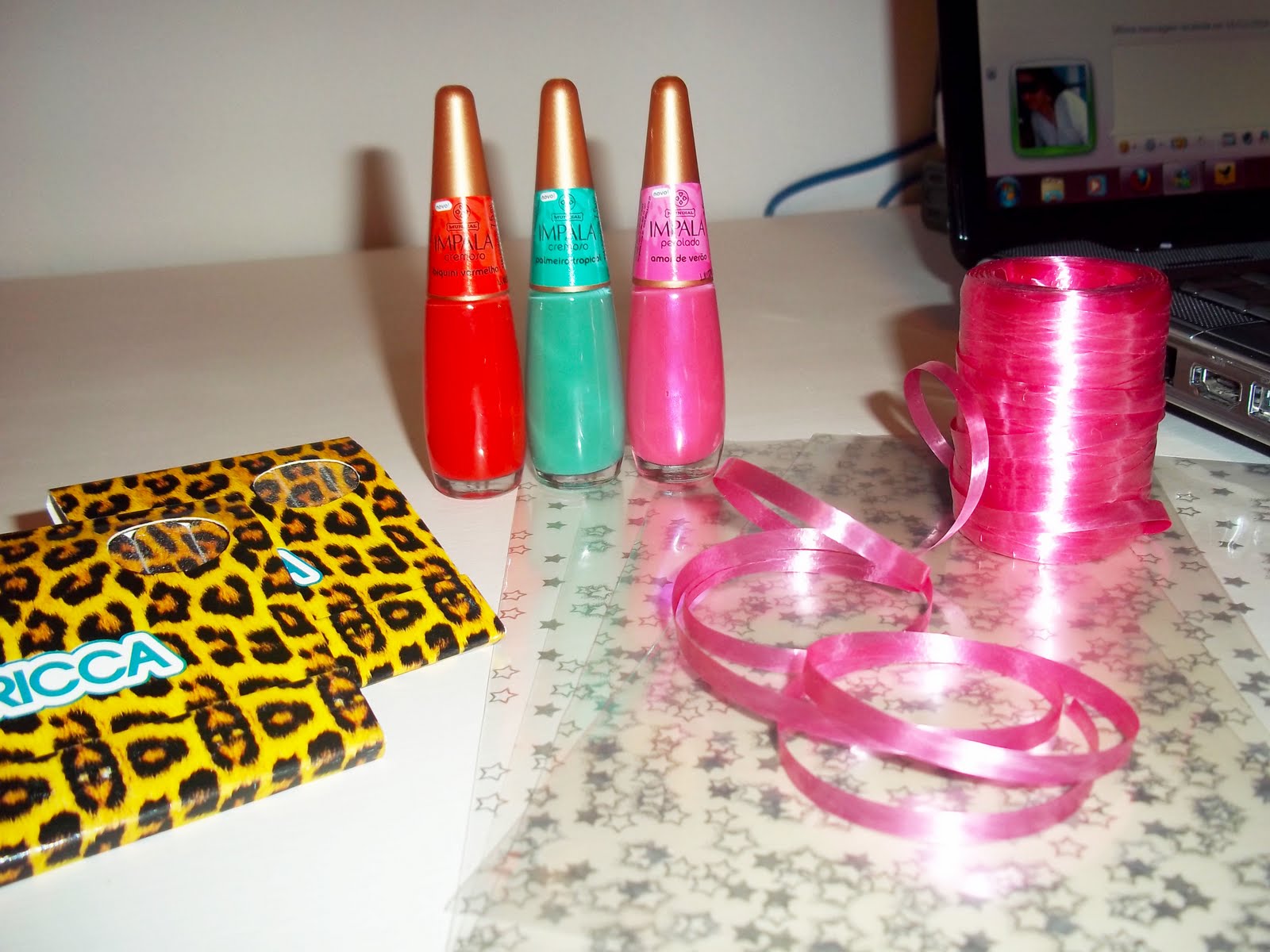 Fiz a conta de quantas amigas eu queria presentear, e como o número que cheguei foram de 12 pessoas, decidi que um esmalte por menina tava de bom tamanho. Os esmaltes escolhidos foram a maior parte da nova coleção da Impala, pois por ter sido lançada a pouco tempo, era mais fácil delas ainda não terem comprado, garantindo assim, o sucesso das lembrancinhas.
