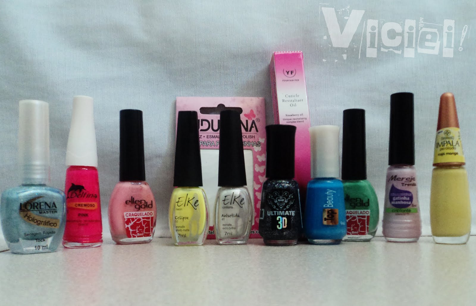 Kit 2: Adesivo para francesinhas da Ludurana, Caneta com óleo hidratante para a cutícula com aroma de morango, Tock, da Lorena, craquelados CR-9 e CR-19, da Ellen Gold, Simplesmente Azul, da Top Beauty, Expression of night, 3D da Top Beauty, Eclipse e Antartida, da Elke, Pink, da Delfino, Cajá Manga, da Impala e Gatinha Manhosa da Mereje.