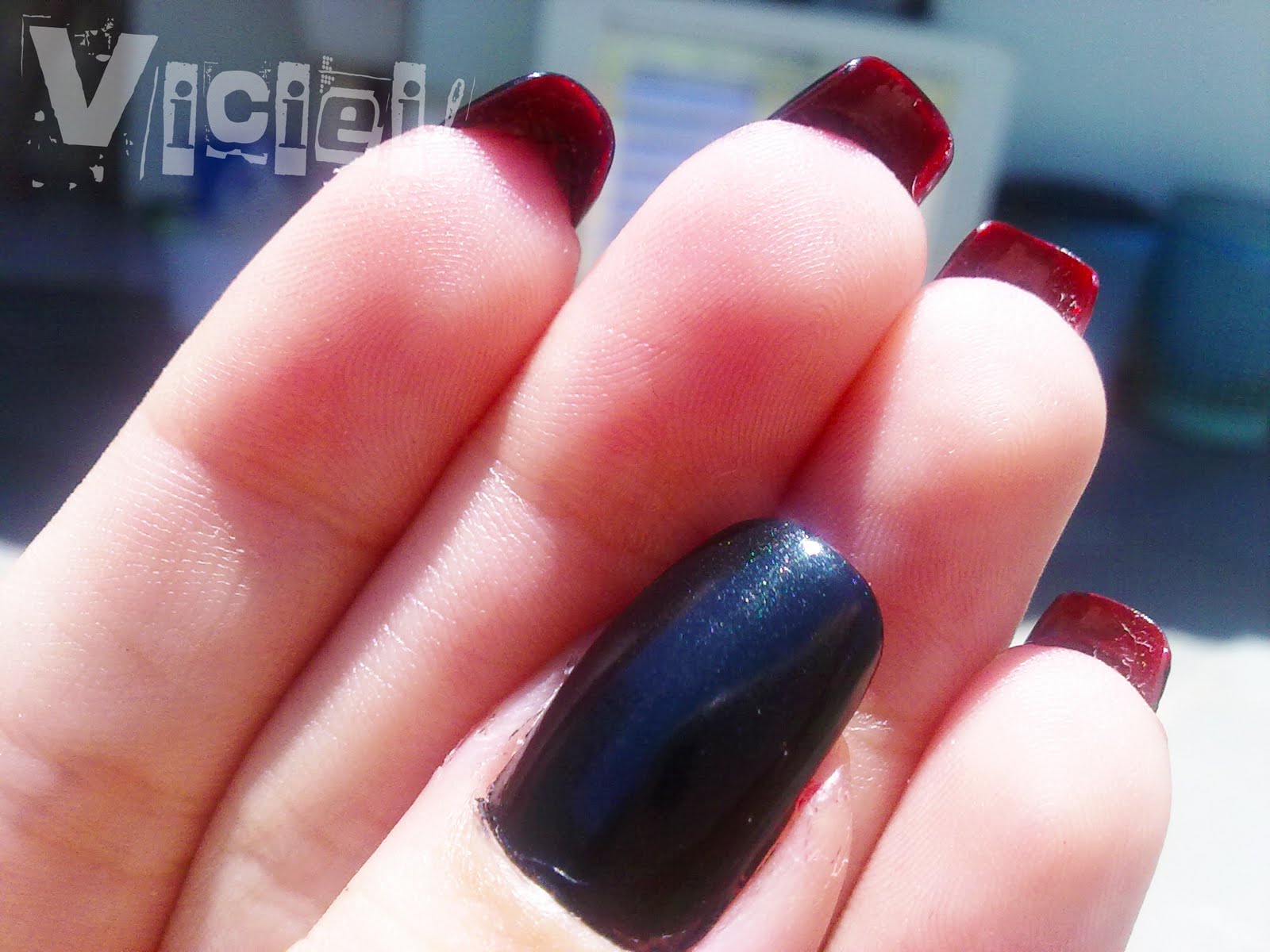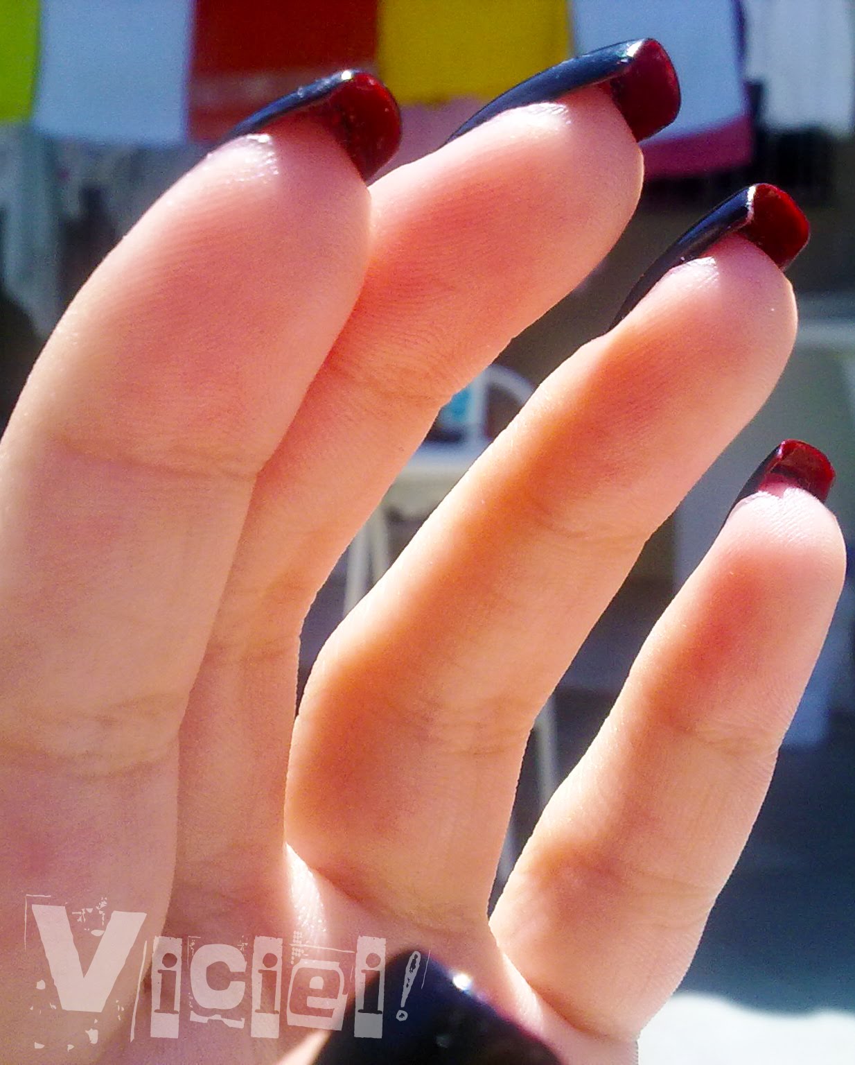 Cuidado na hora de passar o vermelho, para não encostar o pincel na frete das unhas já esmaltadas com o preto. E para retirar o borrado, é bom usar um palito fino, umedecer bem no removedor e começar da base da unha e ir movimentando de um lado a outro ate não restar nenhuma manchinha.